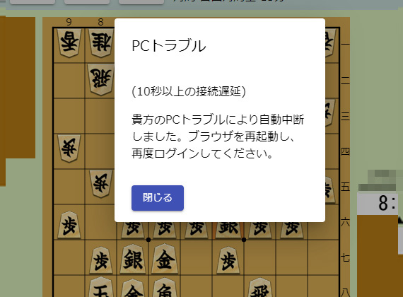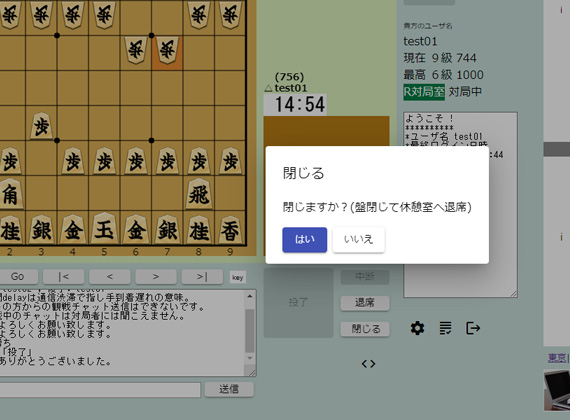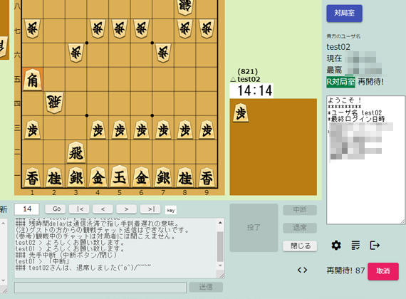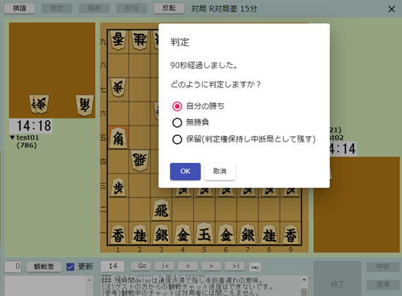 - 相手接続切れなどで中断したら、1分半待ち、判定あるいは中断のまま残すか決める。