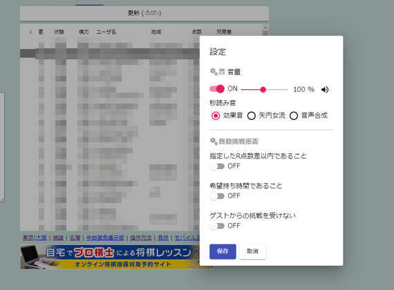 - 指定R点差、希望持ち時間、ゲストアカウントか否かによって、自動的に挑戦拒否ができる