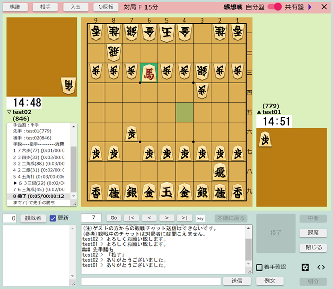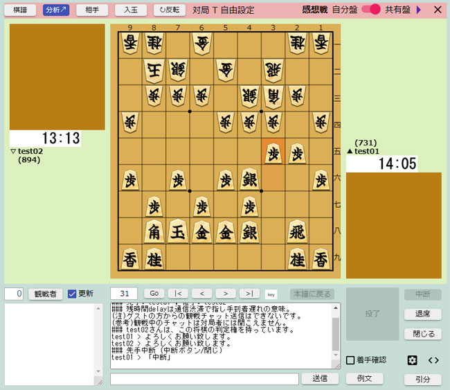 - 動かした局面は、相手および観戦者に伝わります(共有盤のみ)。