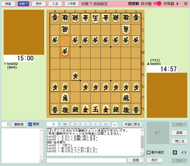 - 対局終了後、自動的に感想戦(共有盤)に移行します。