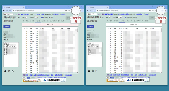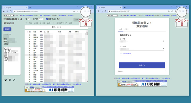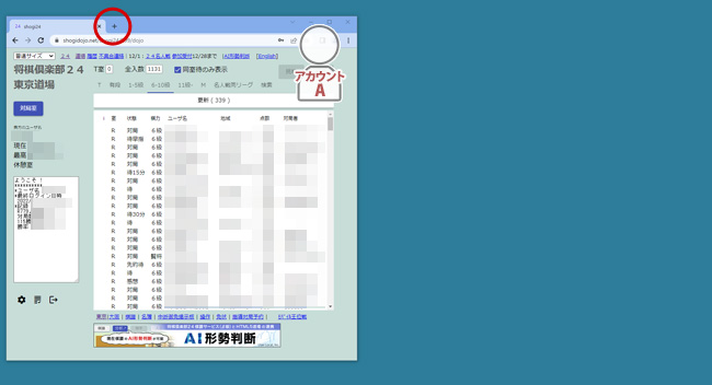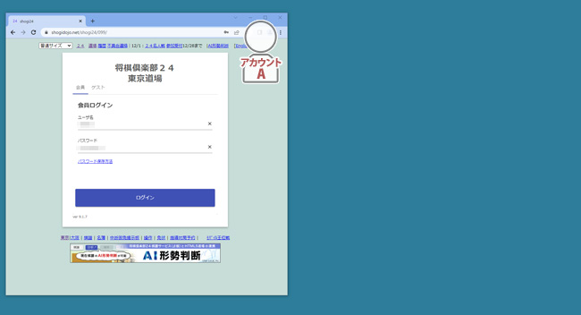 (4)(3)で開いた新規ウィンドウでも将棋倶楽部24を開き、2つ目のアカウント(アカウントを複数持っている場合)、もしくはゲストログインで道場にログイン
